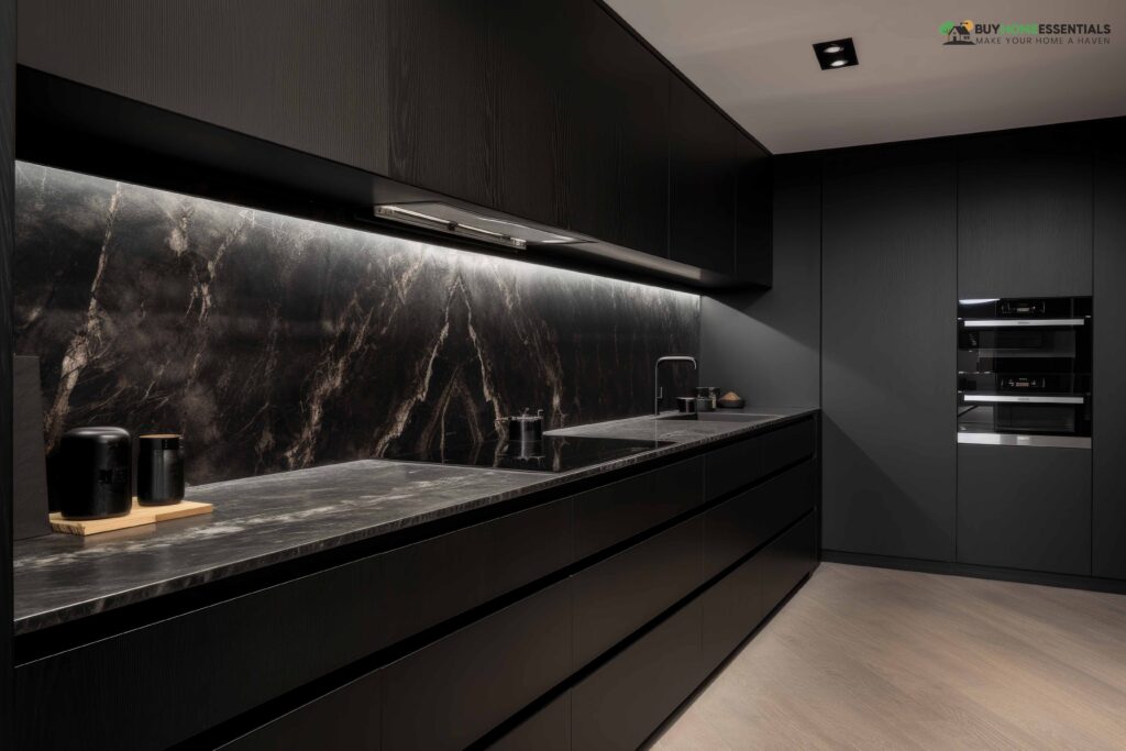 The key to making this monochromatic approach work is achieving the right balance. Incorporating contrast and depth into the space is essential to keep it from feeling too dark. Use light-colored backsplashes, stainless steel appliances, or reflective surfaces to balance the black.
